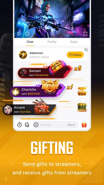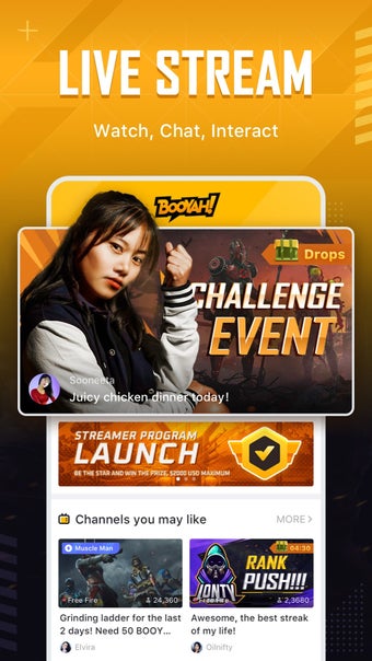 Al igual que Twitch, BOOYAH te permite deslizarte a través de un feed de momentos de juego cortos y seleccionados, navegar por varios videos de juegos completos y seguir a creadores que juegan los juegos que más disfrutas. cierra la brecha entre la visualización casual y la participación activa al permitirte unirte a salas de chat y entrar en comunidades de fans.